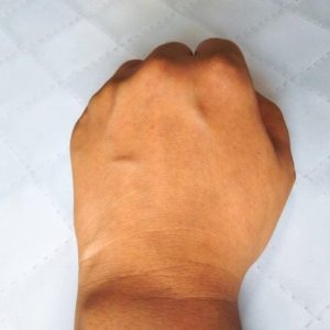 人差し指の下、薬指の下(甲の真ん中あたり)の血管が目立つ部分をクマに見立て、ミネラルファンデーションを専用ブラシで重ねてみました。